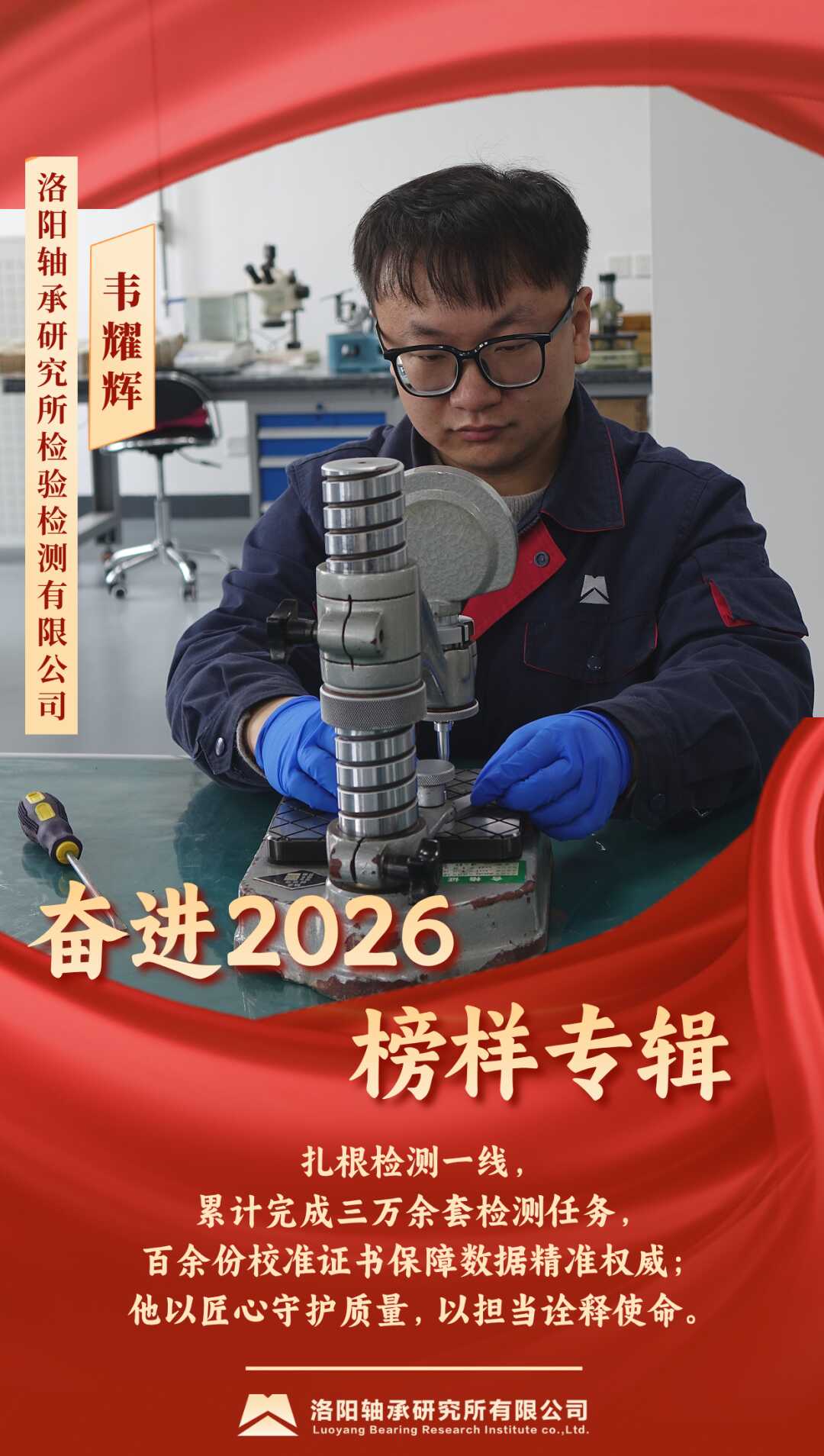 韋耀輝同志從事軸承檢測與校準(zhǔn)一線工作,累計(jì)完成檢測任務(wù)三萬余套,獨(dú)立出具校準(zhǔn)證書百余份,確保各類數(shù)據(jù)真實(shí)可靠,切實(shí)守護(hù)產(chǎn)品質(zhì)量底線。他積極參與技術(shù)規(guī)范建設(shè),編寫作業(yè)指導(dǎo)書并參與校準(zhǔn)規(guī)范修訂,在質(zhì)量監(jiān)督抽查及“雙創(chuàng)”項(xiàng)目中發(fā)揮重要作用。并通過持續(xù)學(xué)習(xí)與深入實(shí)踐,不斷提升專業(yè)水平。作為共青團(tuán)員,他主動(dòng)承擔(dān)急難任務(wù),嚴(yán)守質(zhì)量安全底線,經(jīng)手產(chǎn)品無質(zhì)量事故,班組全年安全生產(chǎn)零事故。他在平凡崗位上以實(shí)際行動(dòng)守護(hù)產(chǎn)品質(zhì)量,為企業(yè)發(fā)展貢獻(xiàn)力量。